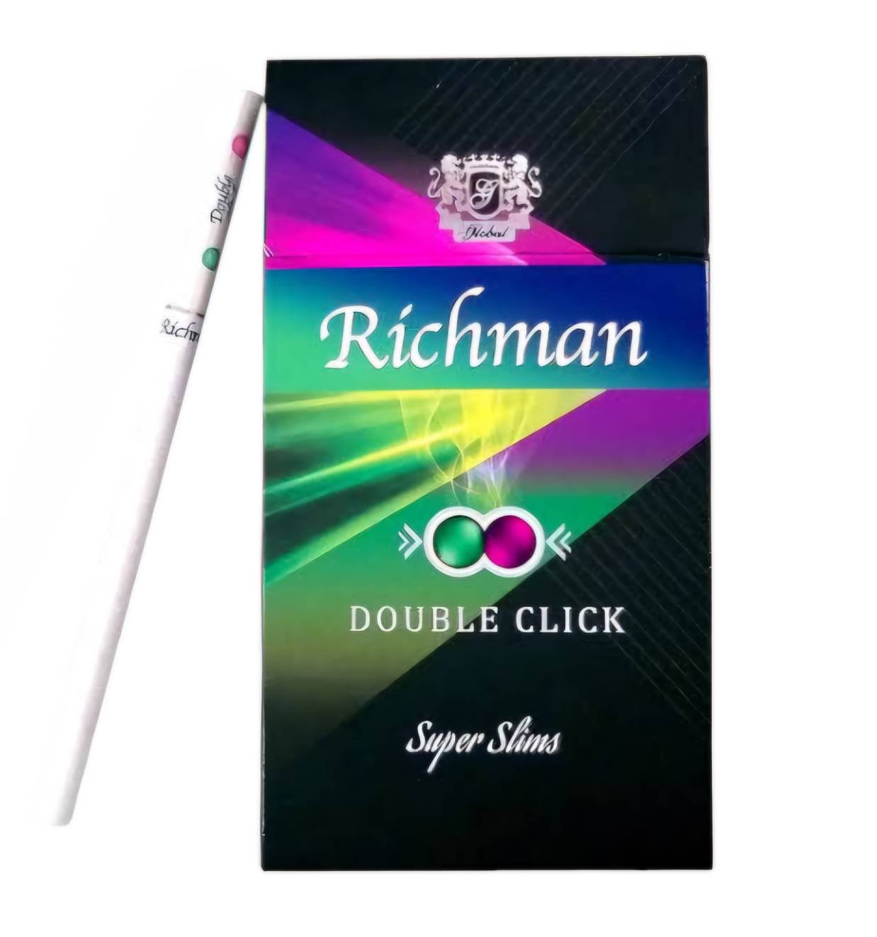 บุหรี่นอก Richman Super slims บุหรี่ RICHMAN DOUBLE CLICK มวนสลิม เป็นบุหรี่เย็นที่มาพร้อมเม็ดบีบหอมของกลิ่นผลไม้ ( แอปเปิ้ล + บลูเบอรี่ ) ที่ให้กลิ่นหอมสดชื่น ให้ความรู้สึกผ่อนคลาย และความเย็นที่ลงตัว ใบยาคุณภาพ สูบนุ่มไม่แสบคอ ลูกค้าบุหรี่สายหอมเย็นไม่ควรพลาดเป็นอย่างยิ่ง