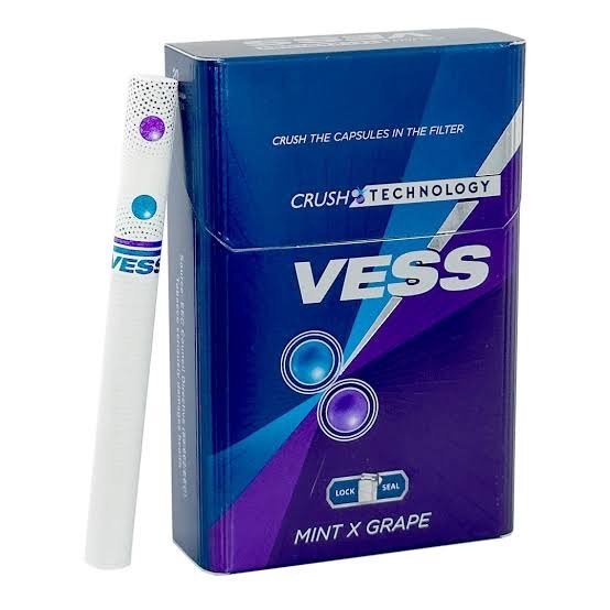 VESS CRUSH MINT X GRAPE เวส องุ่น บุหรี่เมนทอล 2 เม็ดบีบ บุหรี่ VESS องุ่น ซองสีม่วง Crush Mint X Grape หอมโดดเด่นด้วยกลิ่นองุ่นเข้มข้น มาพร้อมความเย็นระดับ 10 ที่เข้ากันได้อย่างลงตัว ให้ความรู้สึกที่ผ่อนคลาย และมี LOCK SEAL กันลมจึงช่วยคงความสดใหม่ของบุหรี่ให้อยู่ได้นานยิ่งขึ้น.